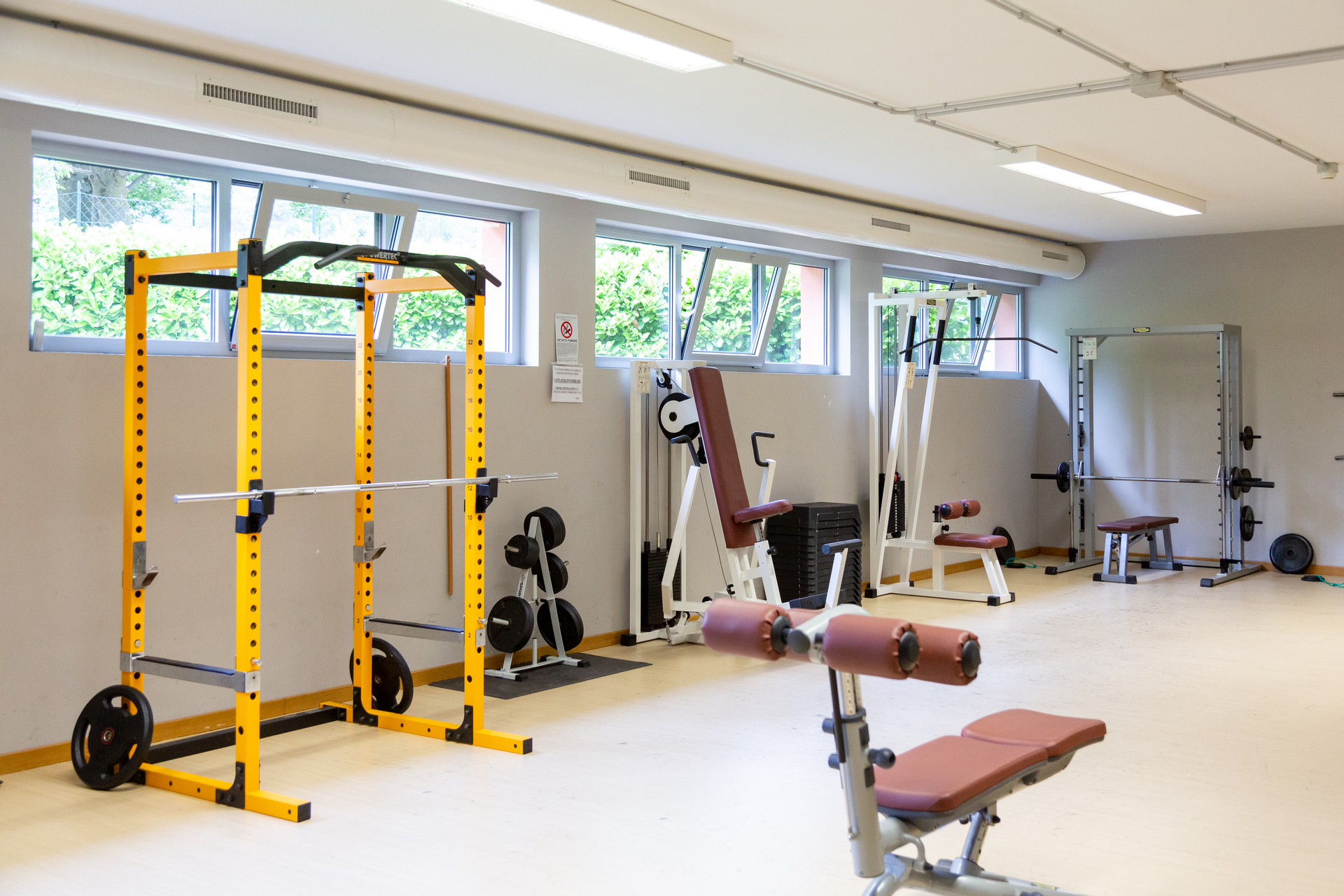 Das Fitnessstudio ist mit Maschinen, Gewichten, Fahrrädern, Laufbändern und TRX Core ausgestattet.